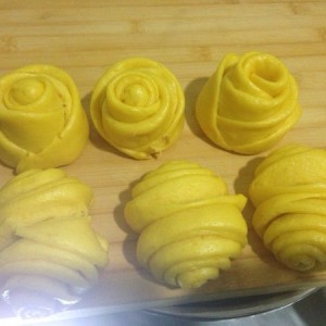 倒入4分之3面粉留一点备用,温水孝母化开、面奶粉糖南瓜揉成团、发2个小时到2倍大!