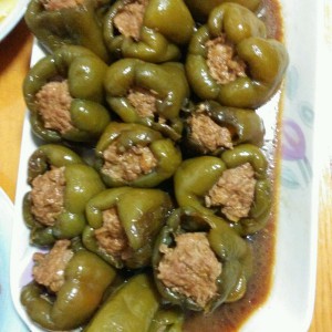 塞好的青椒放入热油锅中,稍炸片刻,至表面起泡后倒入味极鲜和少量水,熟后放糖出锅。