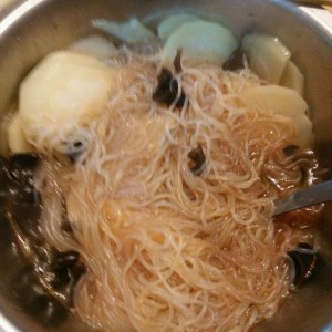 粉丝煮熟,土豆木耳煮熟。捞出全部放入碗里