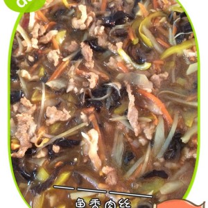 依次放入土豆丝 辣椒 胡萝卜丝 木耳丝 翻炒 然后放入肉丝继续翻炒 加水淀粉 收汁装盘