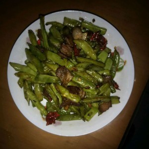 将炸好的芸豆捞出锅,将锅里多余的油舀出来,留点油放入猪肉片,稍微卤一卤猪肉,再加入辣椒蒜末,爆炒辣椒,蒜末,爆出香味之后加入炸好的芸豆加入盐,花椒面,少许酱油,翻炒均匀使调料和芸豆充分混合,即可出锅。看起来是不是很好吃啊?