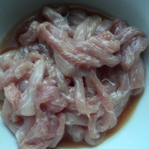 肉切丝,用湿淀粉浆拌匀,加一点蒸鱼豉油,腌一会,这道菜建议拌肉时候不放酒,因为会影响蘑菇本来就有的鲜美