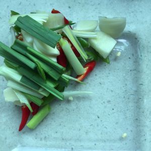一根蒜苗切段,小米辣和二荆条切片或者丝