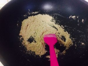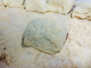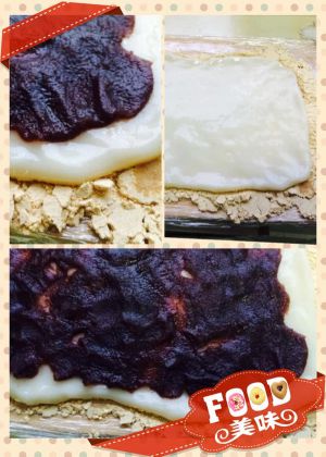 黄豆粉铺一层,糯米粉蒸好后,铺上去,手粘水打湿后把糯米铺开,加上豆沙,铺平整后,卷起。