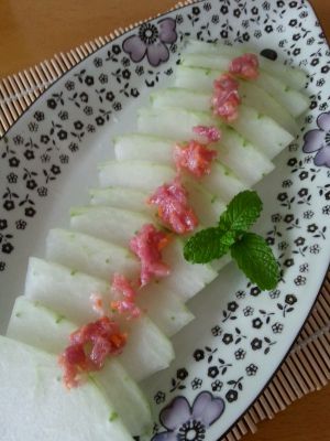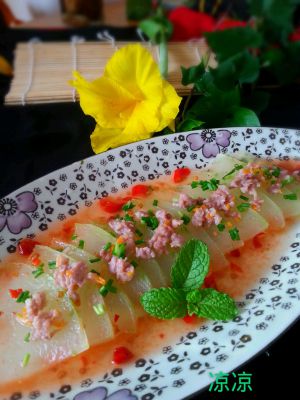 出锅后的冬瓜,调少量剁椒,注意别太多,冬瓜很吸味,多了瓜片不清甜,最后淋少许香油更美味,撒上葱花更香。