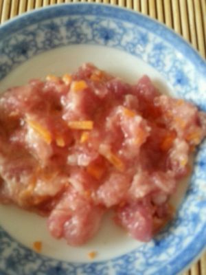 肉末剁好配少量胡萝卜丝(切碎)入少许盐,生抽,糖腌5分钟。