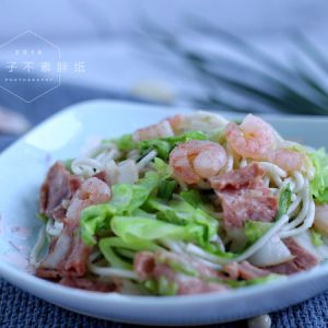 先将包菜洗干净,切条。培根切片,蒜头,葱切碎。