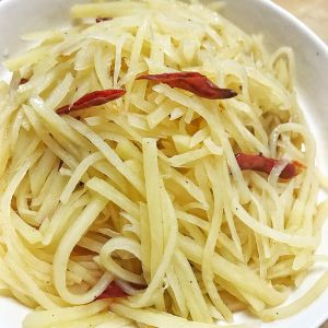 热油下干辣椒丝翻炒两下加入土豆丝,锅边淋一圈醋