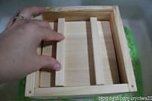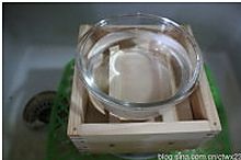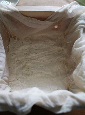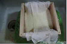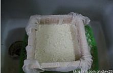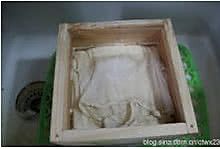 放上豆腐模子(我买的这个木头的稍嫌有些大),豆腐布浸湿挤干,均匀地铺在模具上