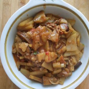 圆茄子(没有也可以用长茄子替代)和土豆以及西红柿切好备用。葱姜蒜切好备用