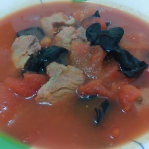 水煮的少了约一半时,加入番茄,番茄酱,白胡椒,盐巴,味精,鸡精,调味!!煮的番茄都软,番茄汤浓郁,即可出锅!