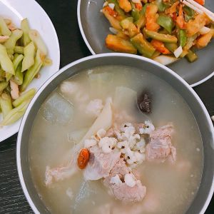 排骨焯水后温水洗净,放入砂锅,倒入开水,同时放入薏米,红枣,姜片,葱段,大锅烧开后小火炖2个小时,放入冬瓜,枸杞再炖至冬瓜软烂就可以了,放入盐。