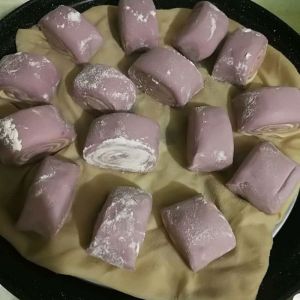 这是外面放白色的,里面放紫色的,卷起来切好就可以了,