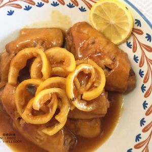 鸡翅两面都煎至金黄后,待汁收至味浓时放入柠檬皮丝炒匀即可。