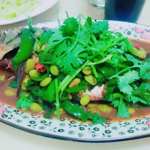 加水,加毛豆,大火烧开转小火约15分钟,加入青椒,大火收汁。