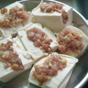 用筷子在豆腐中间夹开一个洞,把调好味的肉末塞进豆腐里面