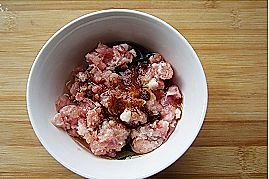 肉馅里加入生抽1小勺、花生油1小勺、麻油1/2小勺、清水2小勺、盐1/2小勺搅拌均匀腌制10分钟