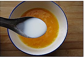 干淀粉加入2小勺清水搅拌成水淀粉,两个鸡蛋加入1/2小勺盐后搅打,然后加入水淀粉搅匀,即成制作蛋饺皮的蛋液