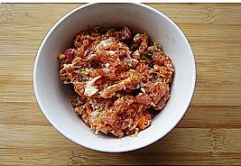 葱姜切末、胡萝卜擦丝后剁碎,然后一起放入肉馅里搅拌均匀,即成蛋饺的内馅