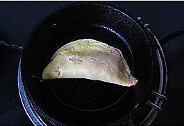 小锅中擦少许油,烧热后放入1汤匙的蛋液,旋转锅子使蛋液铺匀,放入适量的内馅,等到蛋皮凝固,然后将上下两边对折即可拿出,依次制作直到蛋液用完