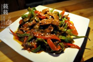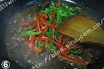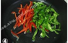 净锅后,热锅中温油将腌制好的牛肉倒入,转动炒锅快速滑散,肉变色后下煸炒好的青╱红椒丝,颠匀起锅
