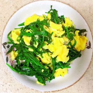 鸡蛋打散加盐先炒,凝结成形就起锅。