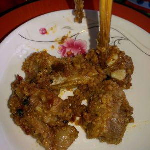 排骨洗净沥干水放小盆里,放一勺豆瓣酱,一勺香油,两勺姜蒜泥(姜蒜一比一)一勺豆豉碎,腌制两小时