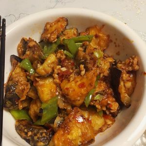 加入青椒片和炸好的茄子,翻炒均匀上色