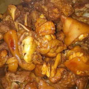 加入料酒,五香粉……大火煮沸,然后加入水没过猪蹄就可以,加入辣酱改小火焖40分钟。