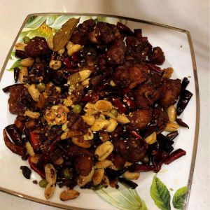 第四步 放入底油 ,放入花椒,树椒短,小火,一定小火,不然会糊,放入葱姜蒜,熟的花生米,倒入鸡腿肉,翻炒,最后放入白芝麻