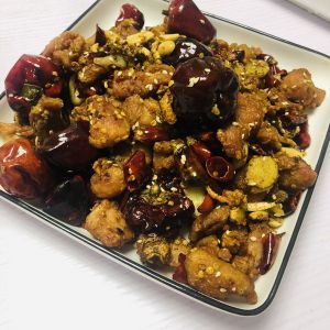 腌制好之后,油烧至冒烟,加入少许姜片,放入腌制好的鸡丁,油炸至整体金黄,差不多了,想吃麻的就加入花椒……作为湖南人我家人不吃花椒我就没加了。加入花椒更美味~Ha ha ha