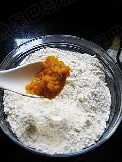 把盐加入面粉中,然后分次加入南瓜茸,揉均后再加第二次。