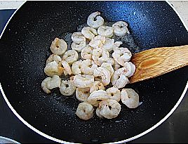 锅中加入1大勺油,油热后下锅滑炒虾仁,虾仁变色后即可捞出。
