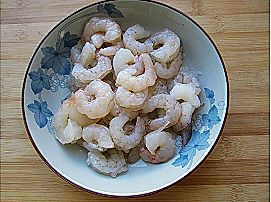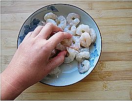 虾仁清洗干净,去掉虾线,加入1小勺盐,加入1小勺白酒拌匀,腌制15分钟