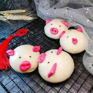白色面团揉成圆形,粉色擀成片装,用小号裱花嘴压出圆形做猪鼻子 筷子戳空