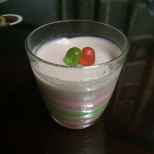2.倒入成器中,然后用保鲜膜盖住,放入冰箱中的冷冻中,这样凝固的快点。等个10几分钟就开始下一层。同上的做法。