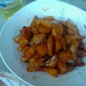 锅中热油,油开后转小火放入地瓜炸至表面有点焦黄捞出。