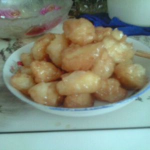 倒入炸好的苹果块迅速翻匀,起锅撤到抹过油的盘子里即可。