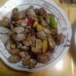 将洗净的花蛤放入锅中翻炒片刻,放入味达美,放入青椒