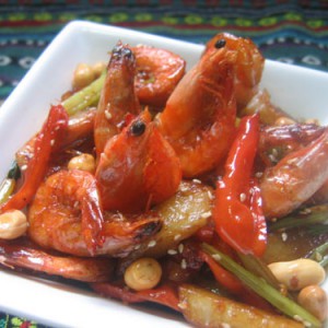 虾剪去虾枪挑出虾线,用盐料酒腌制15分钟。土豆去皮切条。尖辣椒洗净切条。香芹摘去根洗净切段。大蒜和生姜切片。干辣椒切段。葱切葱花。