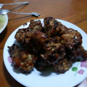 出锅,最后没有及时翻动,有点焦了,嘿嘿,卖相不好,但是味道不错,有可乐甜甜的味道,不过儿子一个没吃,唉,失败啊!