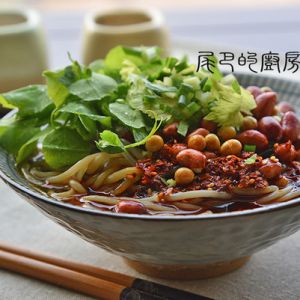 豌豆尖烫熟,和粉条连汤一起盛入碗中,撒上芹菜花、香葱粒、油酥花生、油酥黄豆即可。