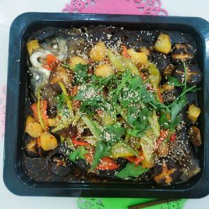 准备配菜:喜欢吃啥配菜就准备啥,比如土豆,芹菜,菜花,藕,香菇,然后炒制大概半熟加花椒粉,辣椒粉,生抽,老抽,十三香各一小勺,配菜要稍微咸一些,然后根据配菜的量加入1~2碗水,煮3分钟