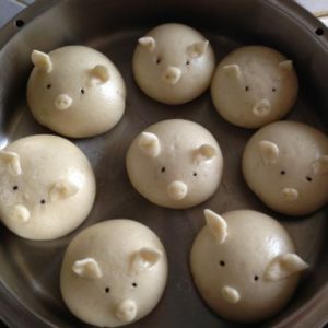 把先前搓好的圆柱形面条准备好,切成稍厚点儿点小圆片,用牙签沾水涂在小猪鼻子然后粘在预留好的面团上,用牙签扎俩小眼,小猪鼻子大功告成。用牙签事先在面团上扎两个猪眼睛,位置一定要选好,不能太近,也不能太远,牙签沾点水,用沾水的牙签,粘一粒黑芝麻准确的沾到眼睛位置就OK了。