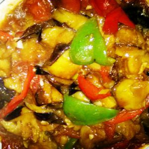 炸完茄子的油倒出,留底油,下葱花煸香,倒入青红椒 西红柿煸炒,再下入茄子翻炒,用酱油调色,加入精盐 白糖 米醋 及少量开水,烧开后调好口味,撒少量鸡粉,水淀粉勾芡,撒蒜末出锅。