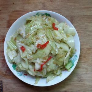 锅热倒油,放入辣椒和蒜蓉,少量盐编炒出香味,倒入撕好的包菜炒软,再加入适量盐出锅前淋点生抽出锅,