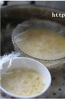 将芒果蛋奶混合液倒在容器中,上锅开蒸,水开后转中火再蒸15分钟左右;