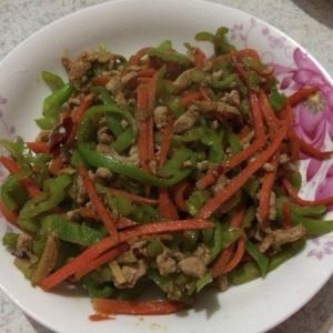 将里脊肉切丝,用料酒、酱油、胡椒粉、姜丝腌制。将胡萝卜、尖椒切成丝备用。