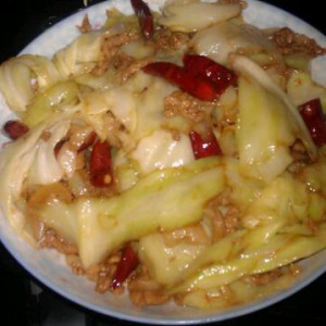 锅内放油,将蒜片放锅里,炒香,接着放花椒,红辣椒(切断),炒香。把控干水分的卷心菜菜放进去,翻炒,将事先准备好的肉放进去,直至看到卷心菜变色,然后放醋,老抽,盐调味,最后快出锅的时候放点鸡精和白糖。