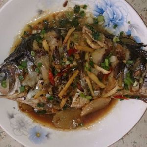 锅中余油,放辣椒、姜、蒜爆香,放入煎好的鱼,加生抽和老抽,加水至淹没鱼,大火煮